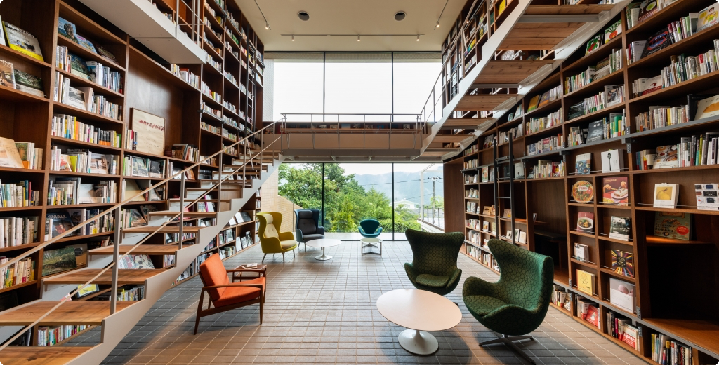 客室全室には、愛書家がセレクトした書籍が並ぶ「あの人の本箱」があり、2つとして同じ部屋はありません。館内には約1.2万冊の本が並び、気に入った本は購入可能です。