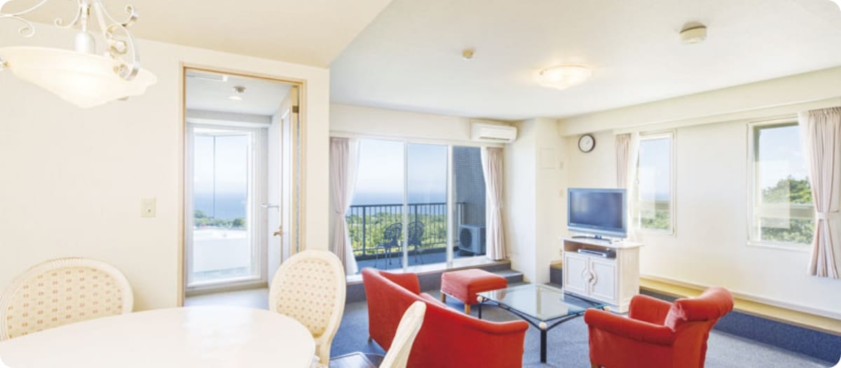 リーズナブルな価格ながら、充実したサービスを体験できるリゾートホテル「ヴィラージュ伊豆高原」。なんと全室オーシャンビューで、美しい景色を見ながらくつろげるのが魅力。部屋にキッチンなどを備えたコンドミニアムタイプのホテルのため、貸し別荘感覚で利用できます。