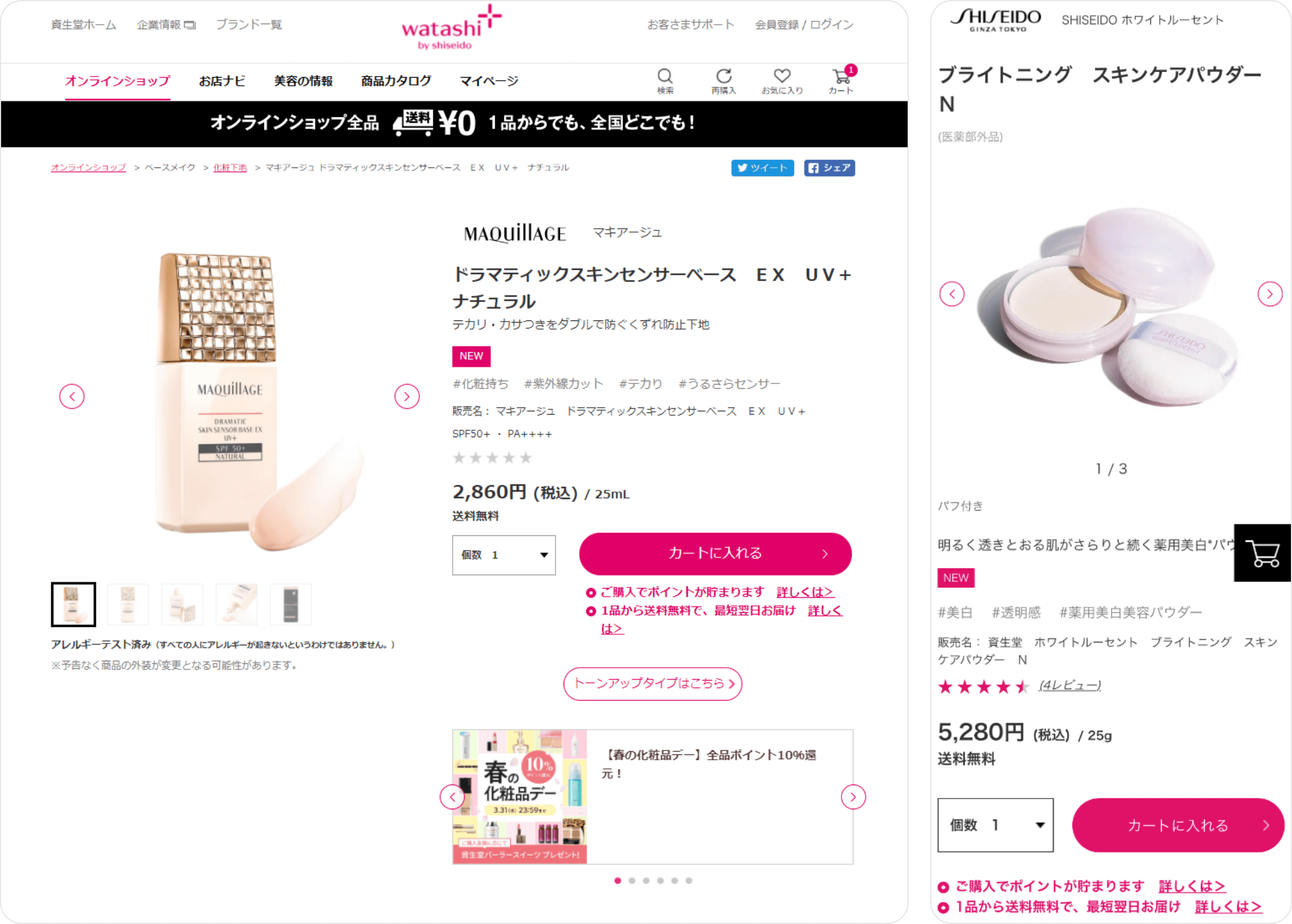 「SHISEIDO」や「マキアージュ」、「エリクシール」「dプログラム」といった多くのブランドのアイテムを取り扱っており、さらに、なんと1品からでも送料無料。