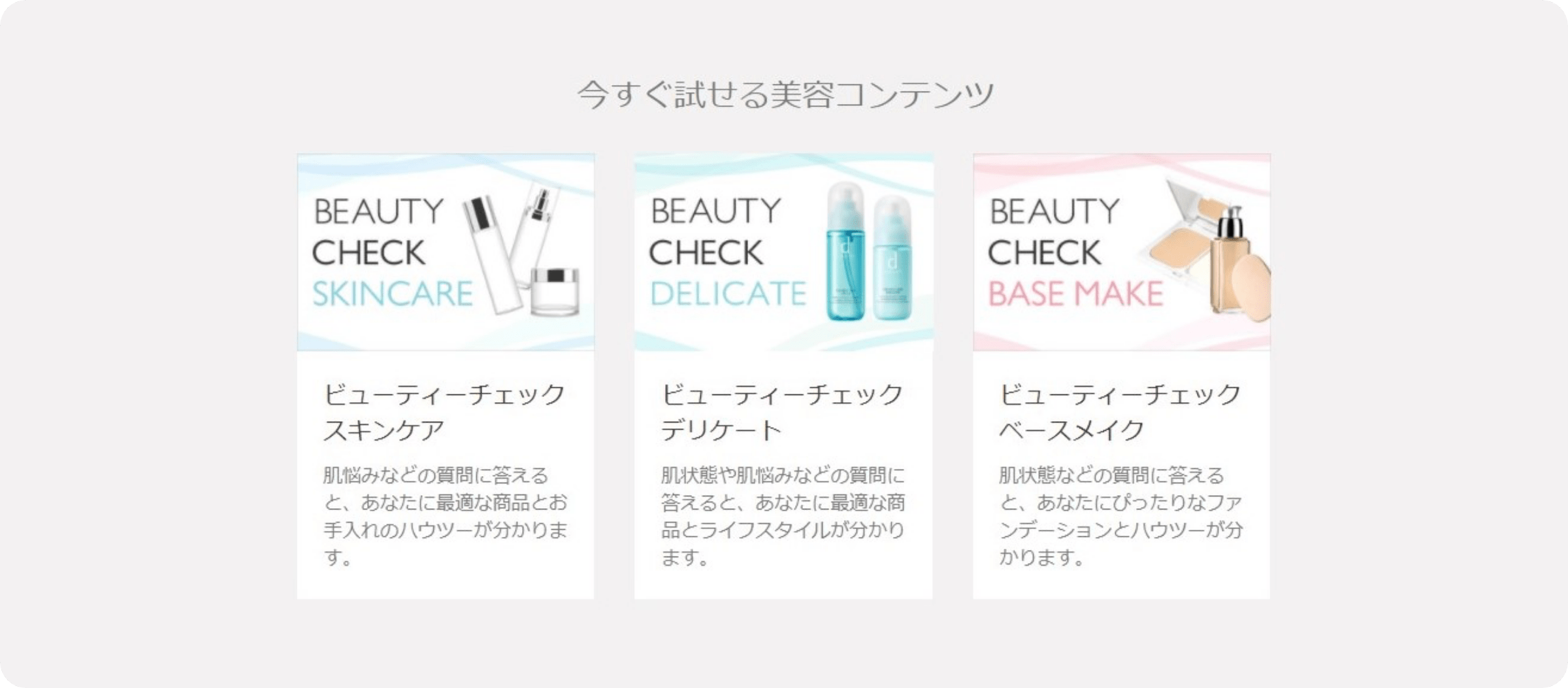 サイト上で質問に答えると、今の肌状態や好みに合わせたおすすめ商品を紹介してくれる「ビューティーチェック」は、「スキンケア」「デリケート」「ベースメイク」の3メニューがあります。