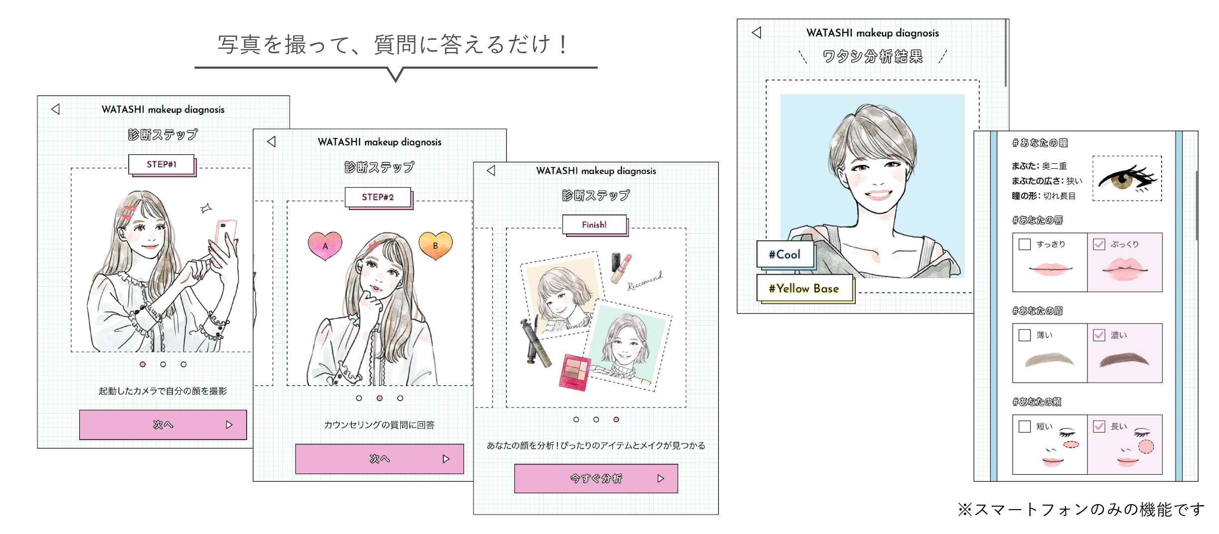 「ビューティーチェック」の3メニューと、自分の顔タイプがわかる「ワタシメイク分析」を使用しました。