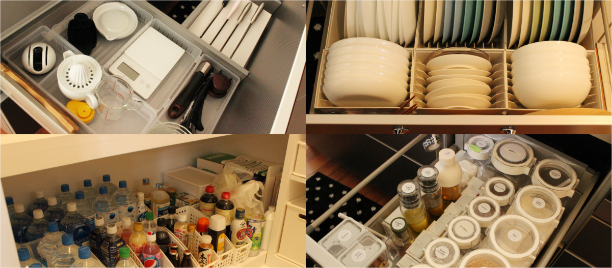 また、キッチンは調理道具やストック食材などで、物があふれがちな場所です。ポイントは家族の人数や収納にあわせた適量を置くこと。以前、整理収納レッスンにお伺いしたお宅は、夫婦2人でしたが、2人分の料理を作るには大きすぎるフライパンがあって、このひとつだけで収納場所をとってしまい、他の物が収納しづらい状態でした。