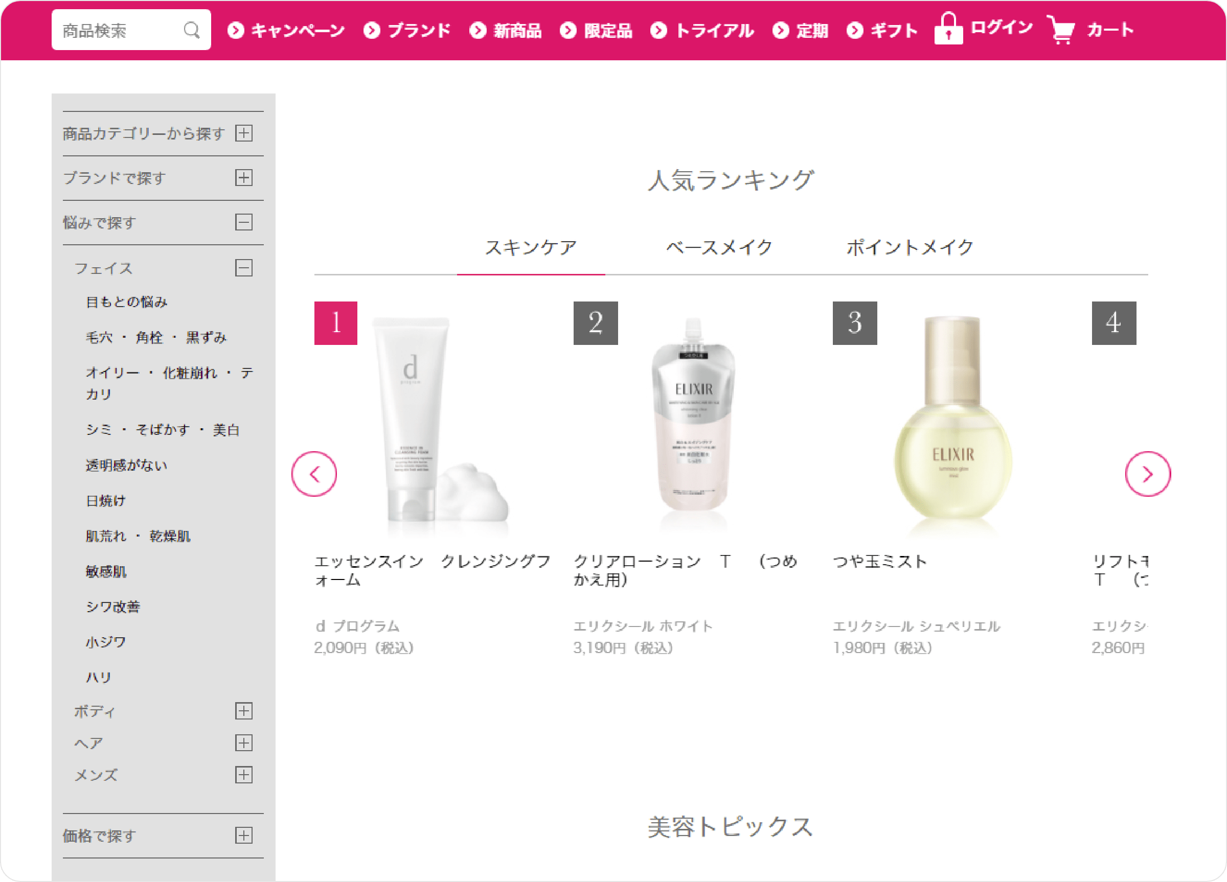 ワタシプラスオンラインショップでは、商品カテゴリーやブランド別の探し方のほか、悩み別での商品検索も可能。例えば先程の「毛穴をケアできるスキンケア」を探したい時は、メニューから「悩みで探す」→「フェイス」→「毛穴・角栓・黒ずみ」と検索をすることで、毛穴ケアの対策ができるアイテムが一覧で表示されます。