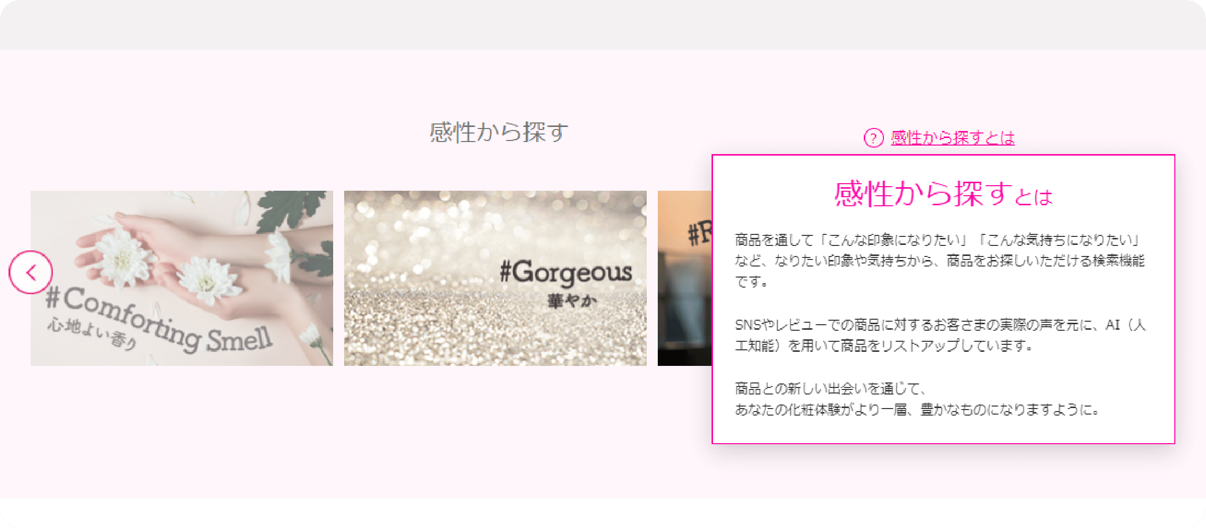 また、悩みだけでなく「なりたい自分」にあわせて、「リッチ」「爽快感」「シャープ」のように、「感性から探す」のも可能。「いままではかわいい雰囲気が好きだったけど、新生活からはキリッとした印象になりたい!」「職場が変わって、好みのメイクができるようになるので、メイクも華やかにしたい」と、自分の理想にあわせてアイテムを見つけることができます。